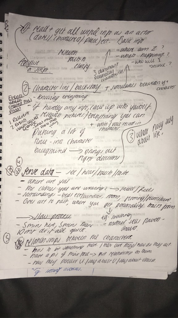 As a group, we worked together practically the skills learnt on a script.We chose a character and then we used our knowledge of sense data, back line and how the character thinks of life to use as motivation for the characters actions in the script.I really loved this as I love acting, but also I found it really fun to work with my teammates while bringing a scene to life.